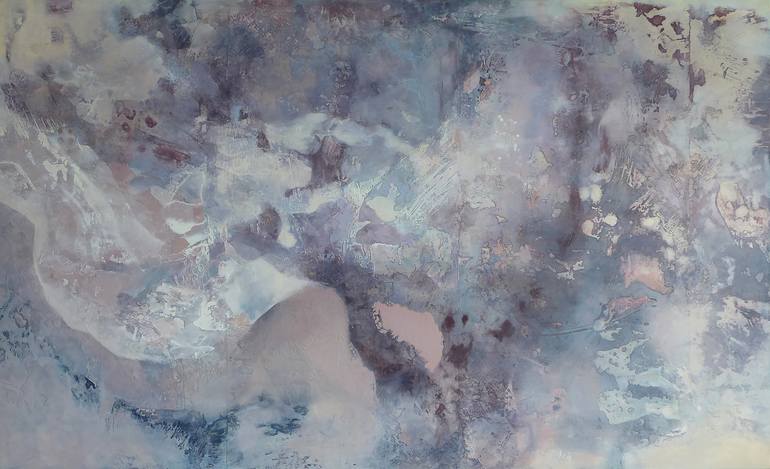 The preparation of this piece before painting was rather complicated but successful at the end. My intension is to use sharp and soft edges in order to experience depth and a mysterious feel. Also the light parts are essential for this matter. Nature is often the subject I refer to.