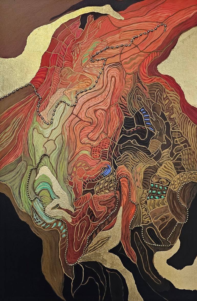 Treasure Island" series captures the enchanting moments of serendipity in life, where luck and unexpected treasures find us. Through the dazzling interplay of gold leaf and vivid colors, the artwork evokes a sense of wonder, abundance, and possibility, inviting viewers to embrace the beauty of life'...