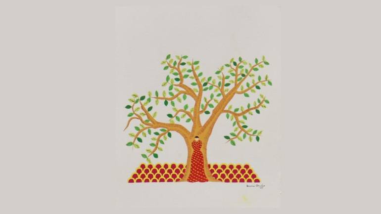 In Indian folk art, we have the theme of salabhanjika, the tree woman. Taking a cue from that, I made this painting. I also wanted to include nature and woman in one painting. It is inspired by the folk art of India.