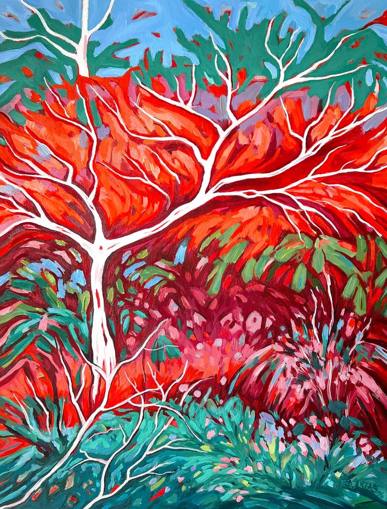 'Tree of Life' is a symbolic garden landscape painting rendered in oil on canvas. The artist's expressionistic and abstract approach results in a contemporary piece with vivid colour. The white of the tree trunk and branches represents pure energy, while the red embodies vigour. An abundance of pla...