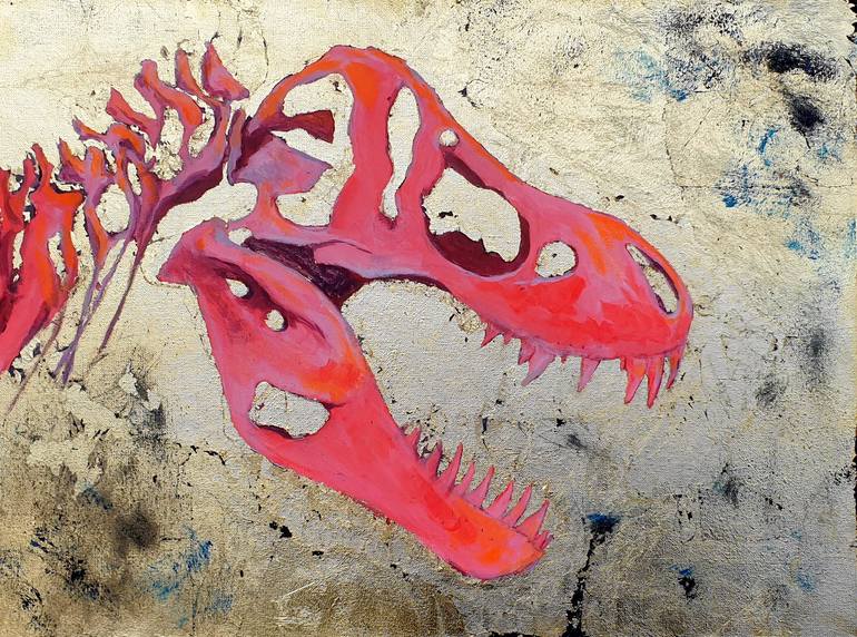 Amazing Tyrannosaurus rex painting on a huge canvas - A real statement piece in hot pink on a distressed gold-leaf background. This artwork will stop people in their tracks - a focal point for any room. If you've got any questions about this piece, or you'd like to commission something similar, dr...