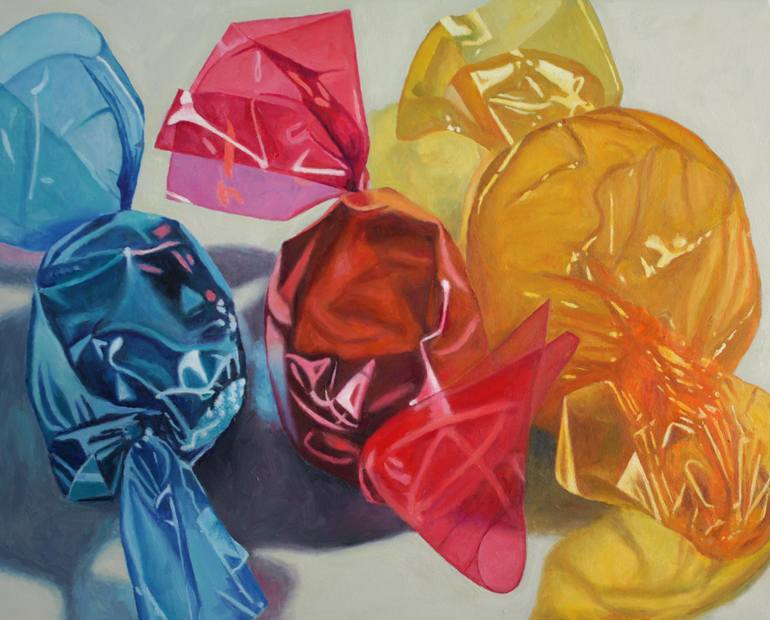 Part of series of paintings of candy. Blue, magenta and yellow cellophane wrapped hard candies lit from the left. A study of reflections and textures and brilliant color. Painted from life, not photos. Gallery wrapped on heavy stretchers with clean white sides. Can be exhibited unframed.
