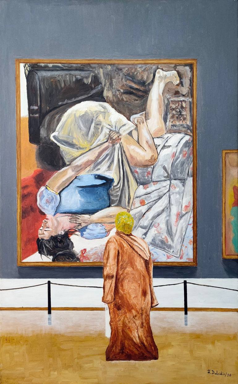 This painting it's a tribute and was inspired in Paula's painting "wallows the Poisoned Apple", 1995 Pastel on paper,178 x 150 cm. The scene is an Arab woman observing Paula´s painting but can,t understand the despair of the westerner woman. Paula Rego, (born 26 January 1935), is a Portuguese/UK vis...