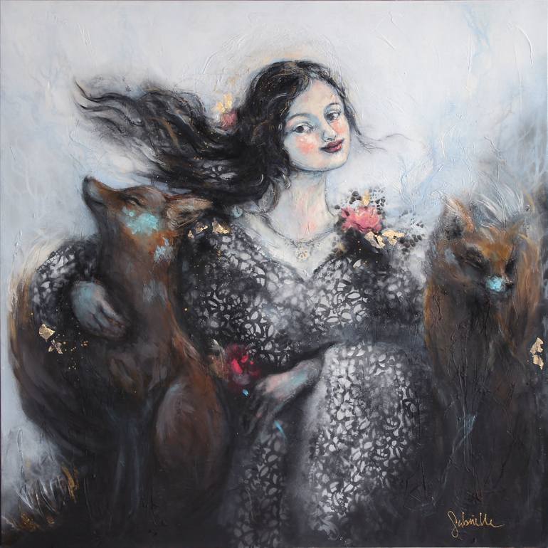 In this work, the woman is surrounded by her two protective foxes, together they form a trinity.