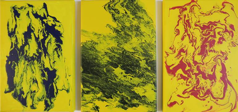 Each one of this Tris expresses something else very individual, is accentuated also by a different color on the same background which is the Yellow base, yellow like hope descending from the Sun. The concrete dimensions are for the artwork put together.
