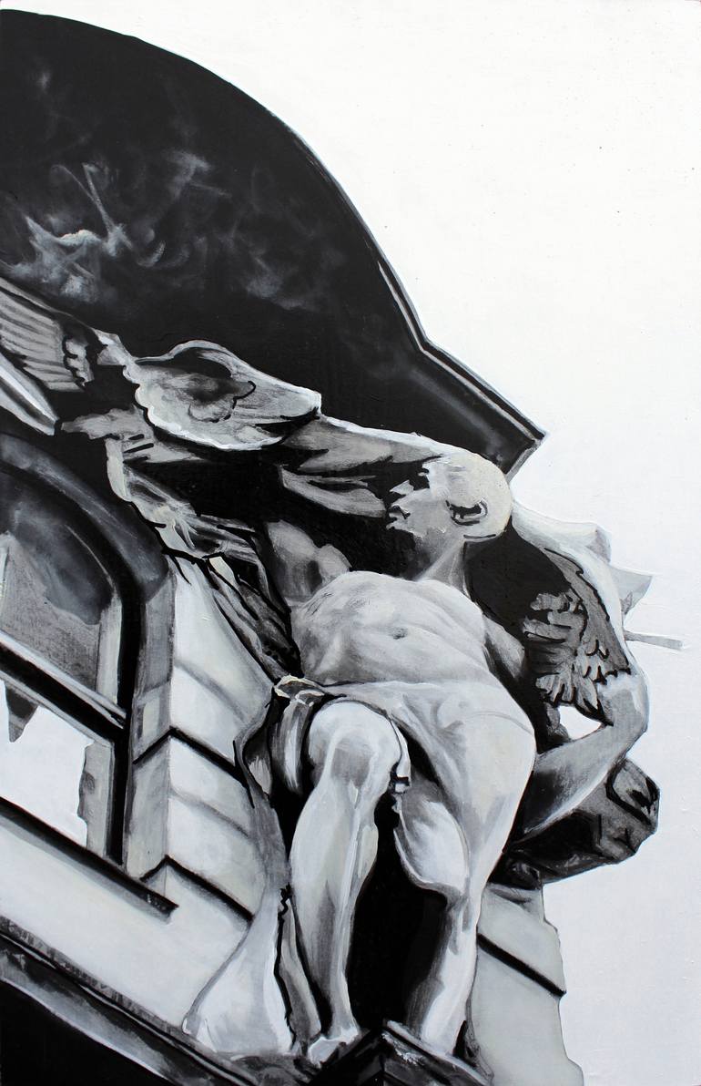 When painting, headdresses and crowns deify Kate Kelton’s subjects. She uplifts the Unsung Sheroes & Heroes, Patriarchy Smashers, Warrior Survivors, Silence Breakers, Philosophers, Truth-Tellers, Whistle Blowers and Thought Giants of all stripes. She paints her portraits cloaked in the garb of statues Ladislav Šaloun sculpted onto the train station that her great-grandfather, Josef Fanta, designed for Prague in 1901 - 1909. Apotheosis through a reclaimed, reapplied Art Nouveau. Sampling her own lineage, she transforms a historical body of work, itself a thing of lasting beauty; exchanging granite for graphite, plaster for paint. In Photoshop, she first combines the desaturated faces she's found, sourced or shot of her chosen subjects, with the black and white photos from her family and friends, of the statues in situ. Then she uses graphite, inks and acrylic paints and glazes to create the works on panel or canvas, literally uplifting and elevating her battle-weary subjects to the highest reach of architectural strata. 'Ancient and distant godlike beings, surveying a dying empire, trade places with the fresh blood of her subjects. The work presents a tactility against the digitized space, and represents a taking, an acquisition of power back from the tastemakers. Here, the mantle of the artist is above brand influencer, above internet commentator, above mere marketability. In their gaze is a warning, “Art is immortal. Come for me, why don’t you?”' ~ Micah Chaim Thomas "Kate's recent work is a matter of expansion through contrast - she is as ephemeral as her subjects are concrete architecture; she is structural when her subjects should slip through your fingers like too-fine sand. Taken as a whole, the works in her magnificent series Sentry are incredibly intelligent, but when looked at individually, you come to understand that these are statements of life beyond themselves. The series take embellishments of a Prague train station designed by her great-grandfather, Josef Fanta, and combines these with portraits of women who have stood against the sexual harassment and assault rampant in Hollywood. These women, like Kate herself, have suffered in the era where powerful men, every bit as immovable as the train station, wielded their power without check. The portraits emblazoned on architectural elements, they are marked against the edifice, every bit as permanent, and perhaps even more defining.