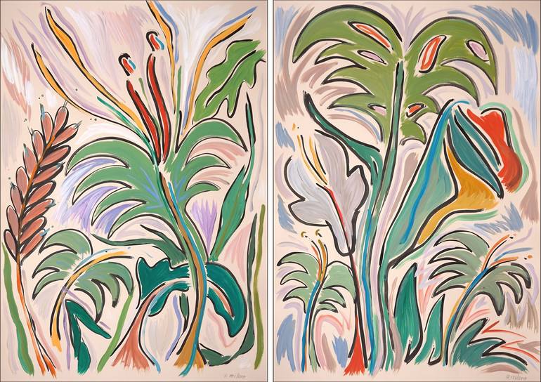 "Tropical Marsh Duo" is an abstract expressionist painting by Romina Milano where a dance of black gestures unfolds across colorful brushstrokes infused with raw emotion. Romina Milano is an Italian artist renowned for her paintings that are primarily composed of strong gestures, vibrant colors, a...
