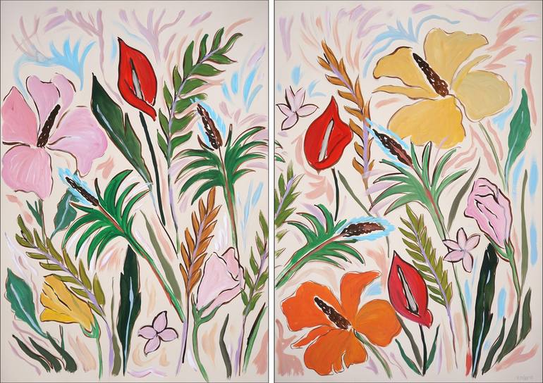 "Tropical Wild Hibiscus Bloom I" is an abstract expressionist painting by Romina Milano where a dance of blue gestures unfolds across colorful brushstrokes infused with raw emotion. Romina Milano is an Italian artist renowned for her paintings that are primarily composed of strong gestures, vibran...