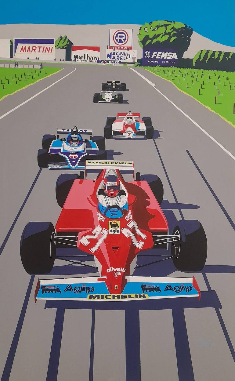 Gilles Villeneuve leads the pack in the final laps of the 1981 Spanish Grand Prix at Jarama. Villeneuve's Ferrari 126CK was often described as a truck due to it's inferior chassis, with Villeneuve himself calling it "a big red Cadillac". What the car lacked in handling, it made up with power. Qualif...