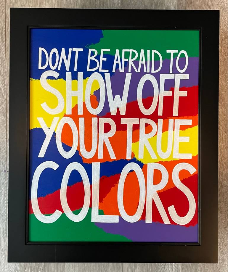 Original piece of art, “True Colors,” by artist Jackson Pschigoda. Acrylic on 20x16” textured canvas board. Framed in a 23x19x.75” contemporary, black frame. Ready to hang on wall and enjoy!