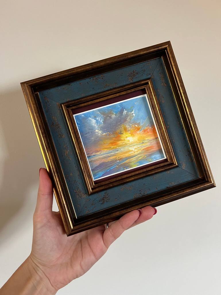 Small Framed Original Canvas-on-board Oil Painting, seascape. True colours, 2024. Dimensions: Unframed Image size 9x9 cm approx Framed artwork size 19x19 cm approx Perfect gift size. Technique- various, from sfumato to impasto. Inspired by the magical and fascinating moment when the sun mee...