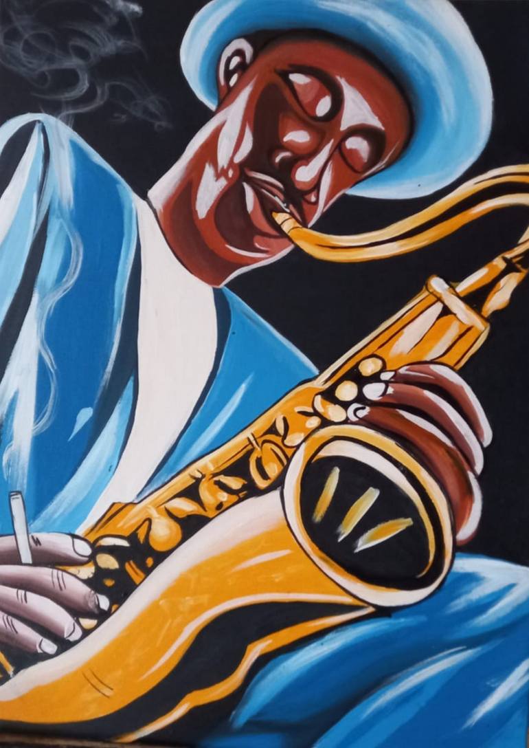 The painting describes Jazz Music as a syncopated rhythms, polyphonic ensemble playing varying degrees of improvisation,often deliberate deviations of pitch,and the use of original timbres.