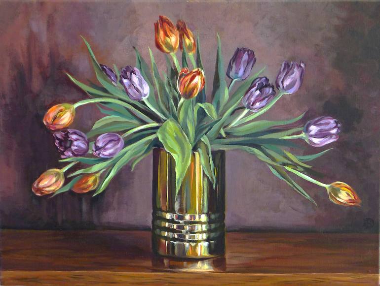 Tulips are the restless bunch. Even when cut, they sway, stir, stretch. Their movement is juxtaposed to the still solidity of the brass container and the sensible heftiness of the wooden table. The undulating nature of tulips is reminiscent of the transient nature of values that humans tend to attac...