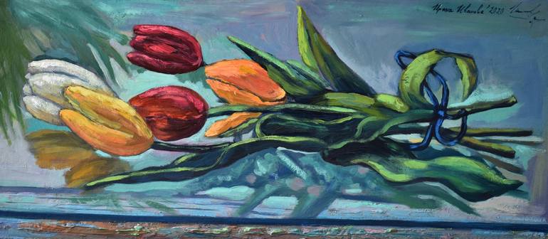 Tulips still life oil painting on cardboard with silver frame. Painting by Irina Ivanova. The still life is painted from nature.