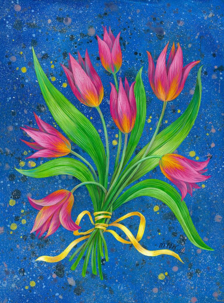 Bouquet of tulips with ribbon on blue background. Beautiful painted with much love for detail.