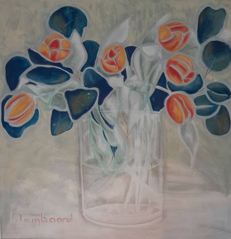 Tulips Acrylics on Boxed Canvas 71 X 71 X 4 cm Tulips is such a delicate flower and I decided to work in Acrylics on boxed canvas. The flowers were in a vase ,catching afternoon sunlight. Perfect for most spaces.The colors are not overbearing ,thus fitting for most spaces and decor.