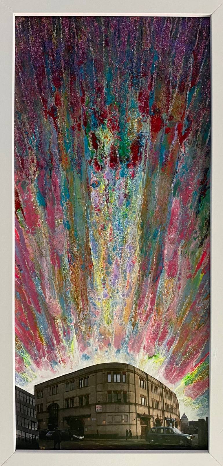 The Turnmills building was a warehouse in the London Borough of Islington that became a bar in the 1980s, then a nightclub. The building was demolished in 2011. Made of recycled materials: reused wooden panels, discarded wall paint leftovers, paper cut-outs of digital images treated with acrylic re...