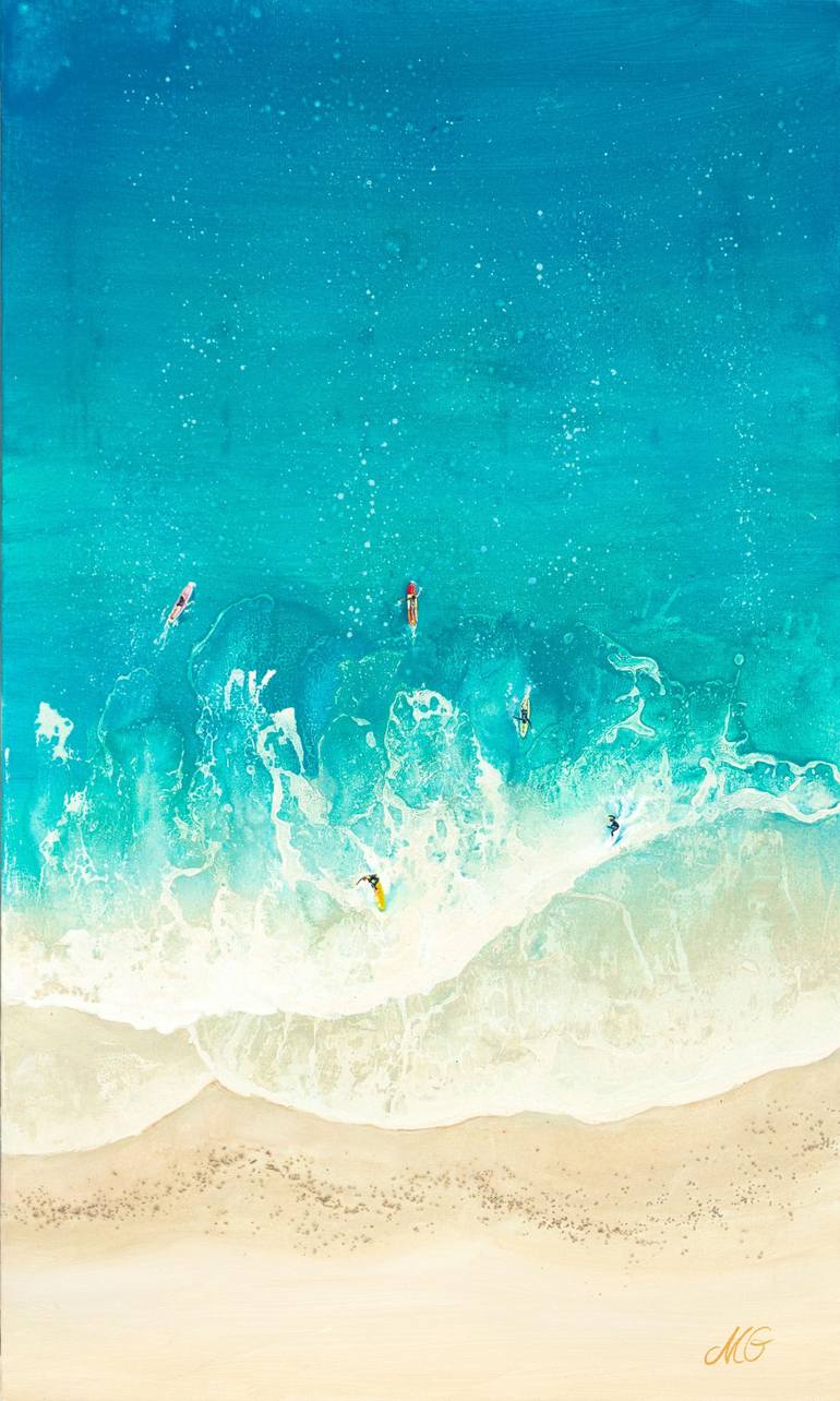 Acrylic and oil on Canvas Varnished on top for UV protection One of a kind artwork Size: 54 x 90 x 2.5cm (actual image size) The painting is framed Ready to hang Signed on the back Style: Expressive and gestural Subject: Landscapes, sea and sky Inspiration - My dream places to visit Turquoise Drea...