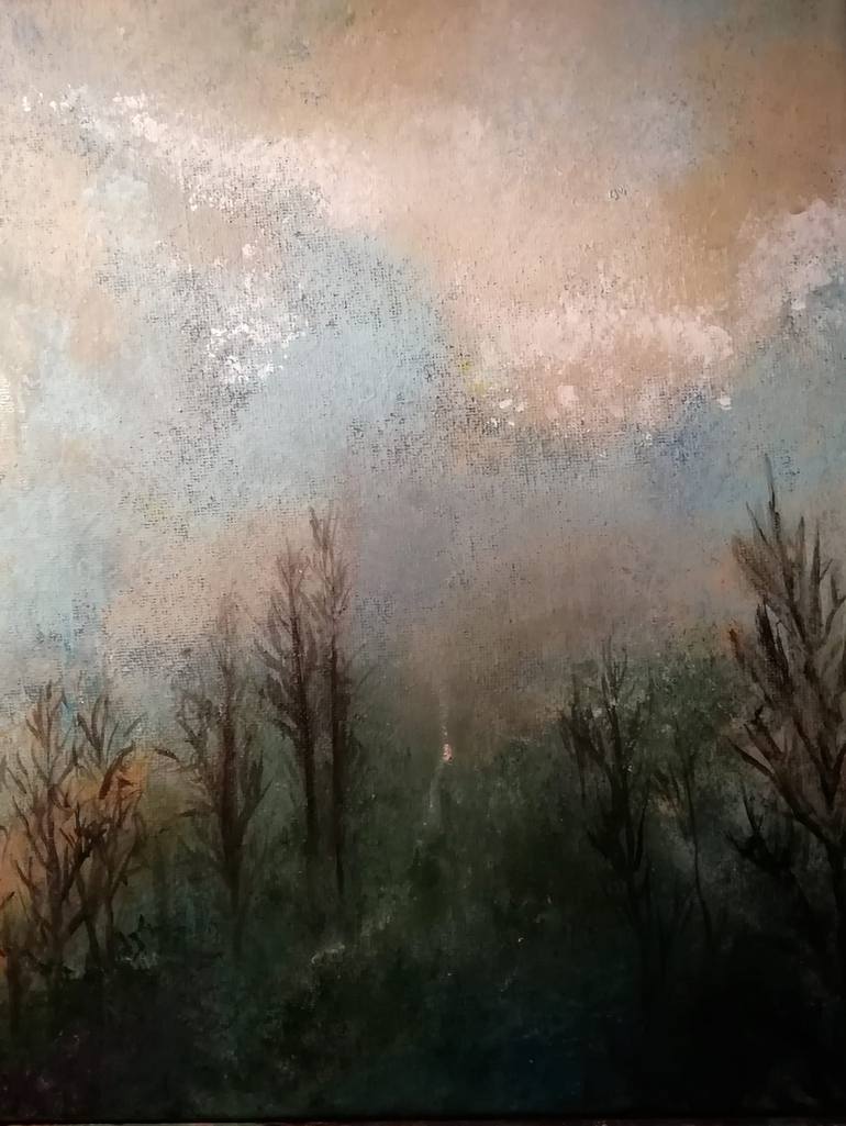 A fairy tale scene. The view is from some height on a dark hilly landscape with some bare trees and a path to a smal light source. A luscious sky above. I like to explore my mental environment and compare that in landscapes, with nature.