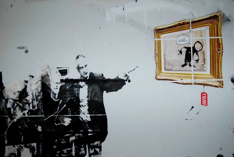 Mixed media canvas. Luc Tuymans pointing at a work of Banksy