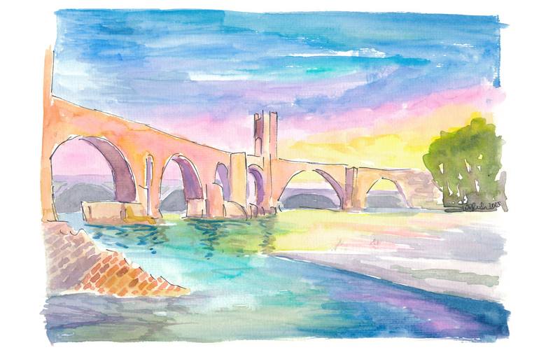 Twilight Serenity Over Besalú Bridge in Catalonia Spain - watercolor on paper