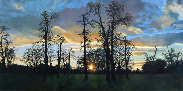View of a park at twilight. The setting sun creates wonderful contrasts and beautiful colors on the clouds above. The mystery in the park was that the trees all seem to have their tops broken off and created an interesting landscape. The sides are painting in continuation of the front. Wired and re...