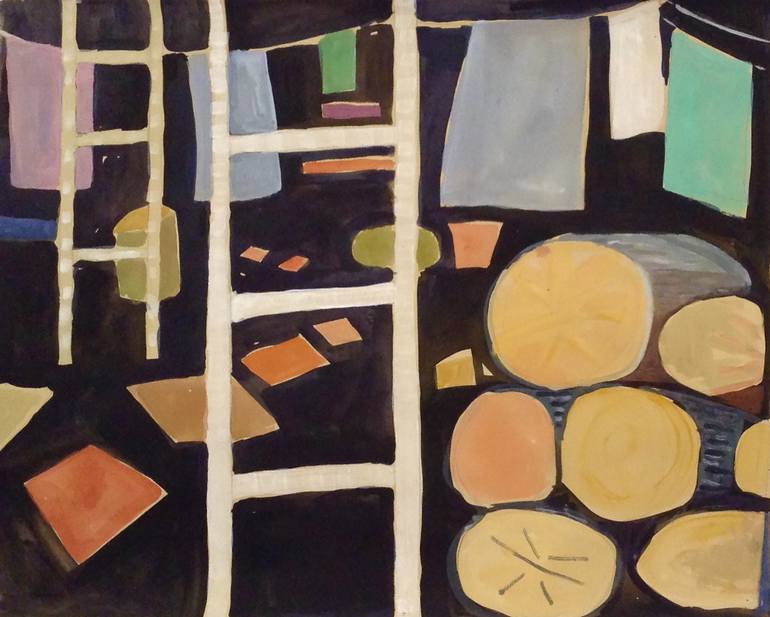 Inspired by the early darkness that comes in the fall, this painting leads the views into a mysterious yet familiar space. We follow the stepping stones past a white ladder shapes and a freshly cut woodpile, deeper into a backyard where colorful , forgotten towels hang on a clothesline. The painting...