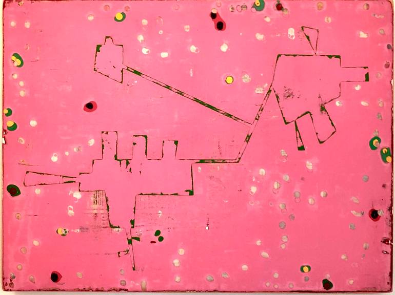 Fun, whimsical, pink painting. Pink ground with inlayed pigments and dots and marks. It also has a green outlined 'Machine'. Very cool and amazing.