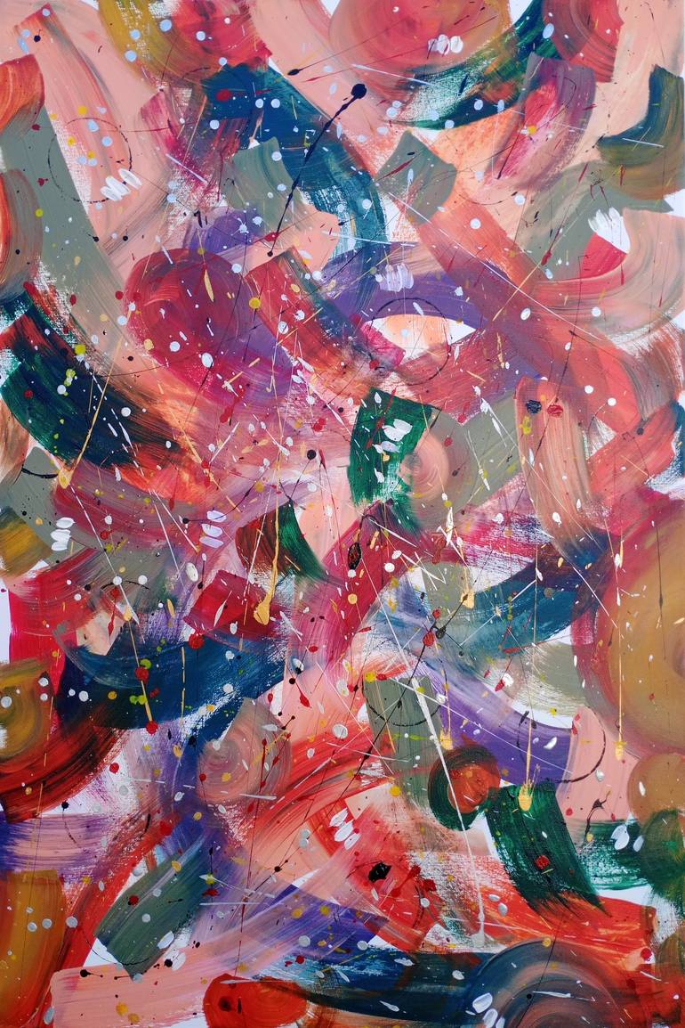 The abstract painting is a vibrant explosion of colors, featuring an array of bold hues of rich colors. Random artistic strokes sweep across the canvas in a dynamic fashion, creating a sense of movement and spontaneity. The composition feels alive and energetic, evoking emotions of joy and freedom, ...