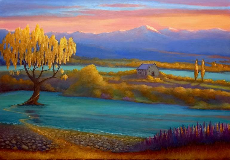 Lake Wanaka and Lake Tekapo in the South Island of New Zealand with The Church of the Good Shepard and the Southern Alps in the background. The tree of gold is symbolic of the treasure inherent in nature and the lupins, although introduced are to be widely seen in the NZ landscape. Metallic gold o...