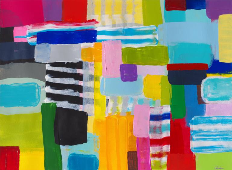 Abstract landscape with stripe motifs and color blocks. Bold color with varied texture, layers, and depth. Acrylic on watercolor paper; a one inch unpainted border surrounds the painting for framing purposes. Signed in the lower right corner; signed, titled, and dated on the back.