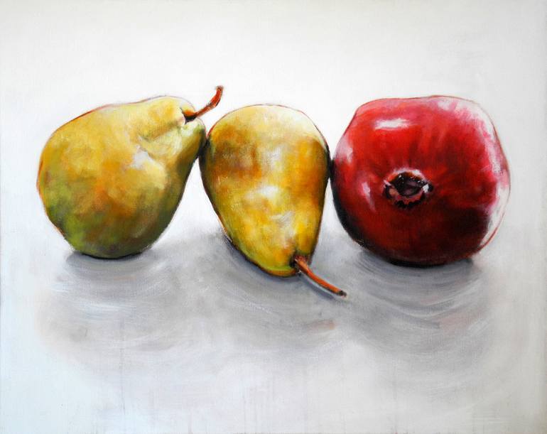 This painting is a bit more realistic than I usually paint but I like the grouping of the fruit and the light.The simple background brings out the color qualities of the fruit. This paint would be great to hang in a kitchen - it has a cheerful quality to it.