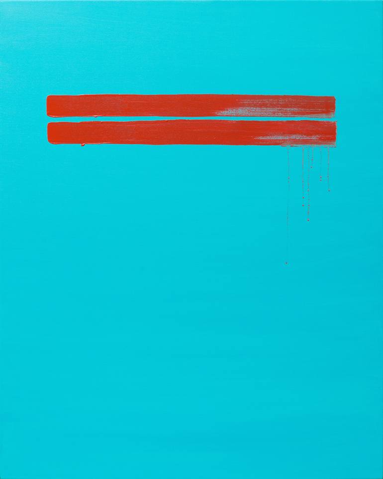 Minimalistic abstract oil painting on canvas with turquoise background and two scarlet strips