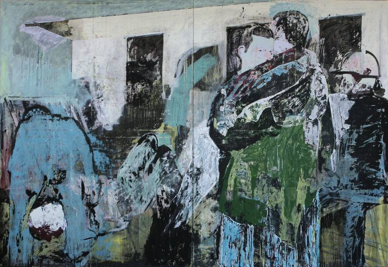 The painting is a combination of a photographic material found in several different photos from magazines and newspapers that lay around in my studio. In the painting there is a couple hugging in the front of a police riot.