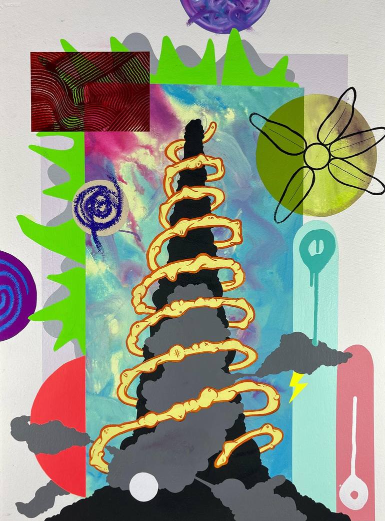 Carlos is a Miami-born, Colombian artist currently residing in Los Angeles. ALL of his life, he struggled with ADHD and OCD. As a coping mechanism, he developed elaborate mental systems to process information. The work gives the viewer a unique look into the way Carlos’ mind works. Is he leaning into his OCD or fighting against where his brain naturally wants to go? When his internal systems became heavy, painting became a way to allow the levity, and the messiness of life in. “For me, painting is a way to explore the realm of risk—risk of disrupting the order, the systems… allowing a certain sense of wild to infiltrate clean lines is an experiment, I never know what will happen. In this way, art is a perpetual practice for me, something I keep returning to because it’s the one place I can make space for both the control and the chaos.”