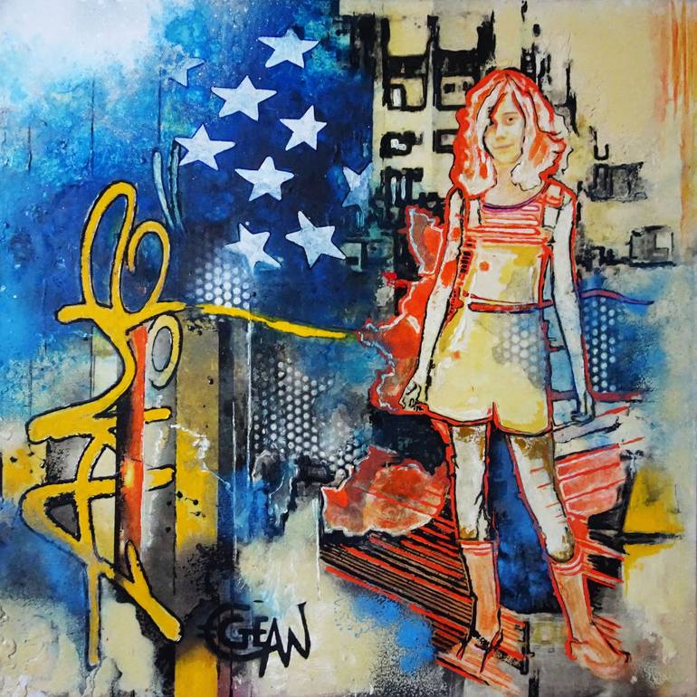 Paysage urbain contemporain. Amélie, positionnée dans un "quartier", une barre d'immeubles en fond, un tag de son prénom abrégé, peint sur une palissade à gauche du tableau. Peinture huile, acrylique, encres de sérigraphie sur toile tendue sur châssis bois. Œuvre exemplaire unique (original) signée...