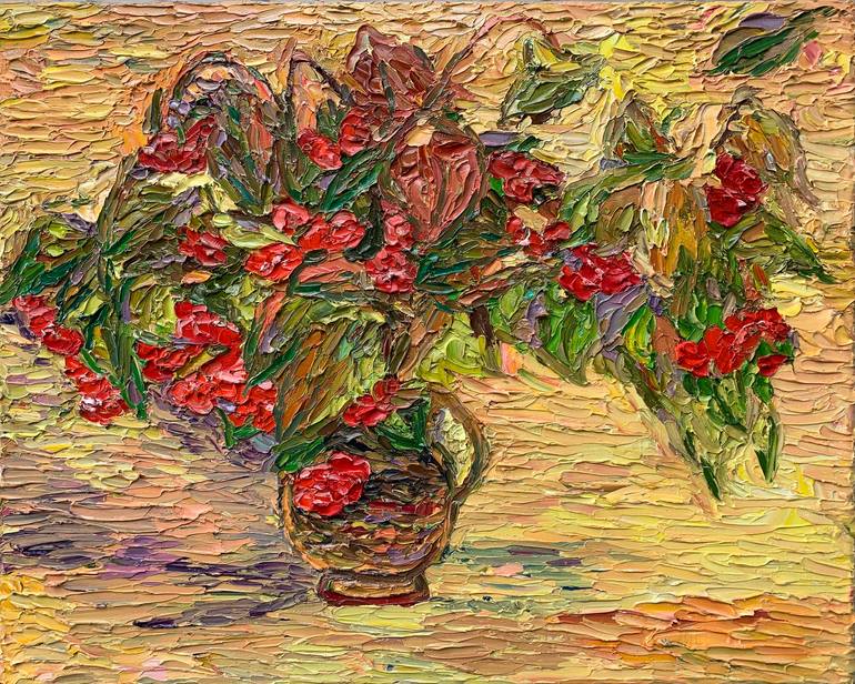 Kalyna ('калина' - viburnum) is the ethnic and national symbol of Ukraine. In Ukrainian culture, viburnum represents beauty, love, motherhood, blood and the immortality. The painting celebrates women’s beauty and love in our lives. This multilayer oil painting has an extremely thick and reach textu...