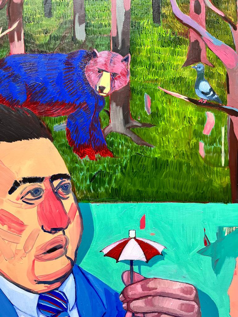 He holds up a cocktail umbrella in defence against nature. This man is under prepared for the pigeon, let alone the bear.