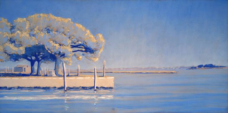 Perched on a quiet quayside in Burano, a few umbrella pines face the Venetian lagoon. It's afternoon, all is calm, and the sun illuminates the unruffled water, bathing a nearby "secca"—a strip of land and grass that the tide rarely covers—the island of San Francesco del Deserto with its tall cypress...