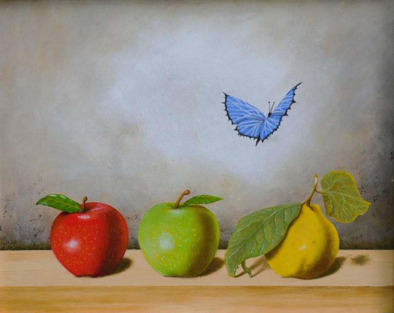 Nono di una serie di nove quadri nei quali ho cercato di smuovere la rigidità della natura morta con un palpito di vita, in questo caso una farfalla che se ne va