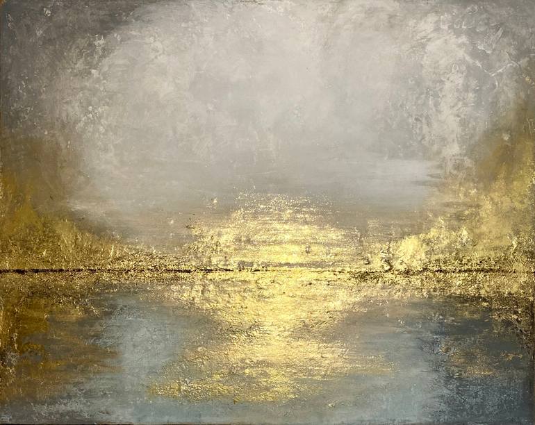 This captivating work of art is distinguished by its bold use of texture and light to evoke an atmosphere that is both ethereal and serene. The painting features a subtle palette of gold, silver or slate blue shades, creating a visual harmony that immediately catches the eye. The composition is char...