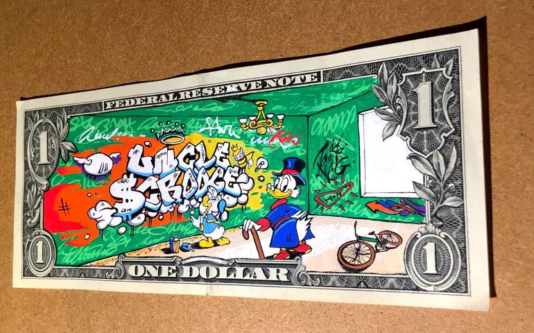 Little graffiti artist Donny Duck paints the walls of Uncle Scrooge’s estate. A 3D Perspective Experiment. Hand painted on original US currency.