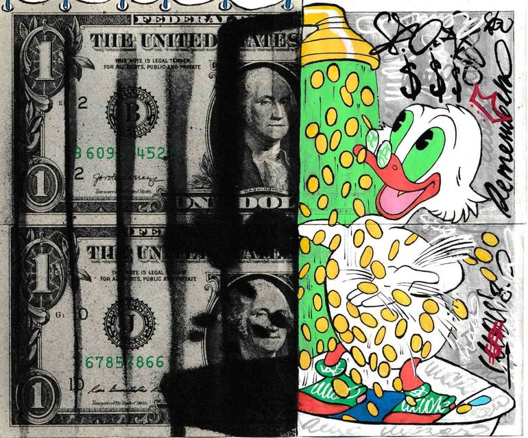 Urban satirical art on money by Moabit, a contemporary street artist who paints about current events and pop culture. Hand painted on two genuine one dollar bills. Collectible work. 2020 limited edition. Signed, numbered and dated on the back. Comes with a certificate of authenticity.