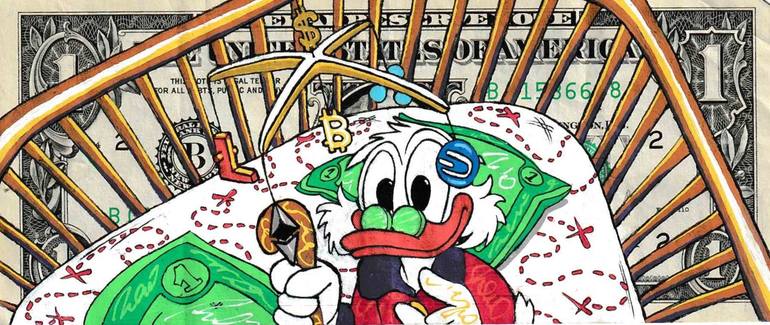 Another in the series of Uncle Scrooge on Dollar Bills, this work is about the current intersection of cyptocurrency and the modern investor. Here Scrooge is a baby entertained by the prospect of future investments.