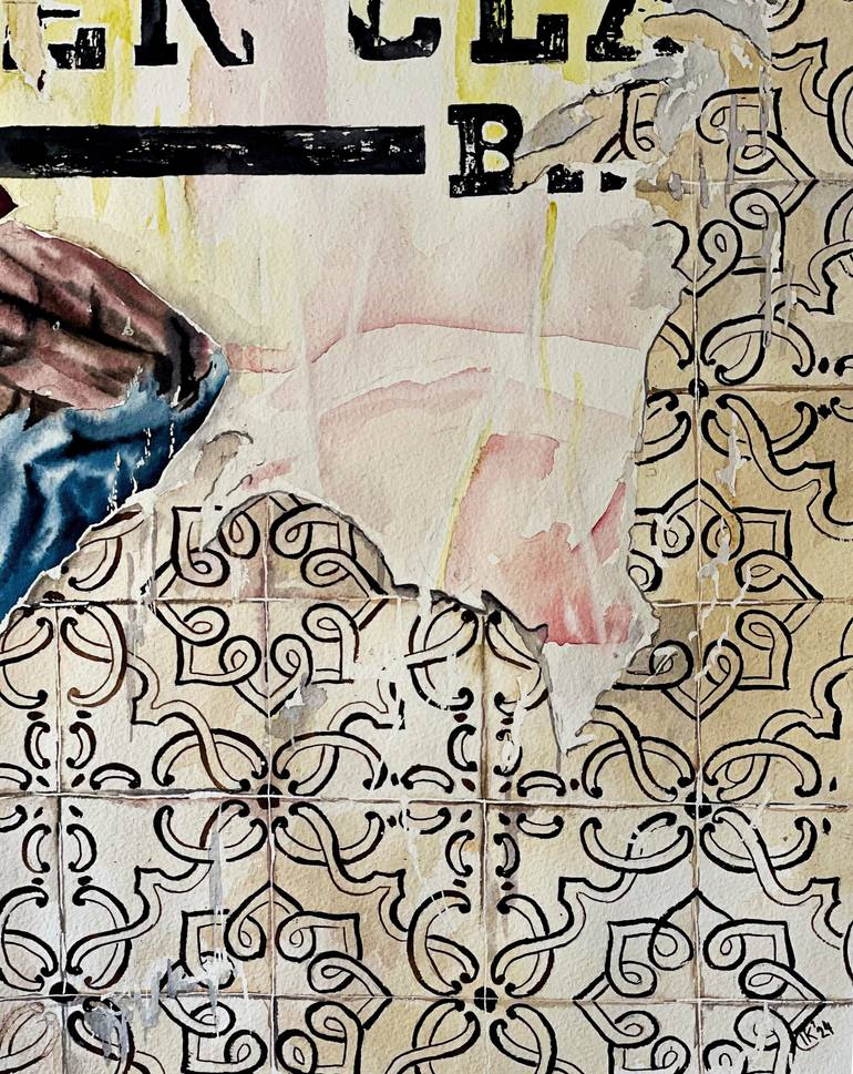 Step into a journey of discovery with "Uncovered Legacy," a captivating watercolor painting that reveals the hidden beauty of Portuguese heritage. This piece features an old wall where beautiful brown and beige azulejo tiles partially emerge from beneath a modern paper poster that has been artfully ...