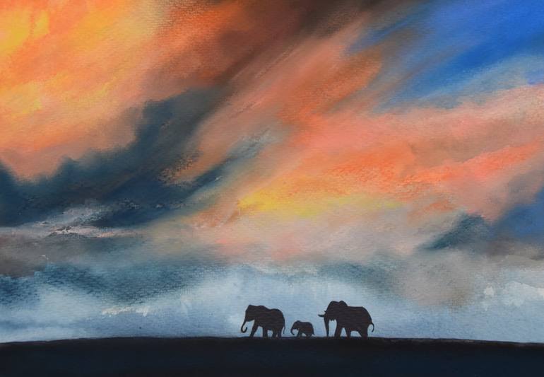 'Under African Skies' inspired by my living in Africa as a child. Fine quality Sennelier pastels and watercolour paints on best quality Bockingford paper, mounted and framed under glass, ready to hang.
