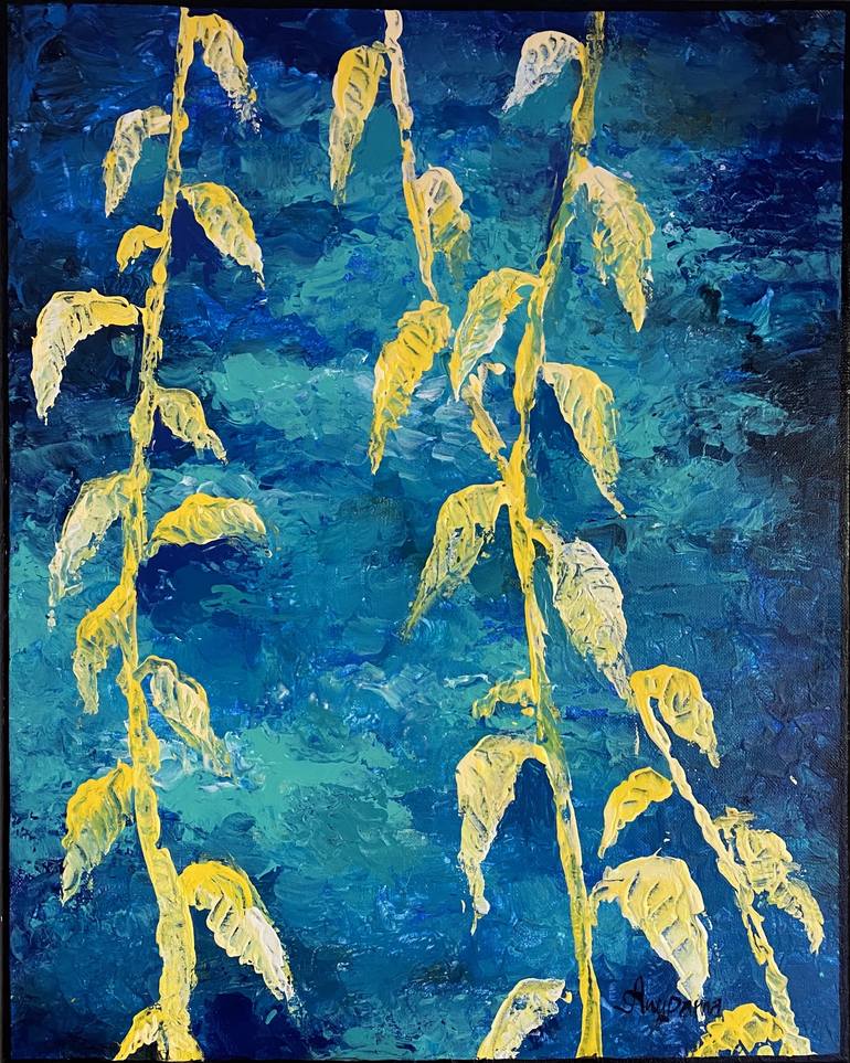 Another one from my Blue and Yellow series. Inspired by an Aquarium trip. Depicts yellow foliage under water in an abstract manner with my favorite shades of blue. This is done in acrylic medium with sides painted black and with a top coating of acrylic varnish that gives a glossy and finished loo...