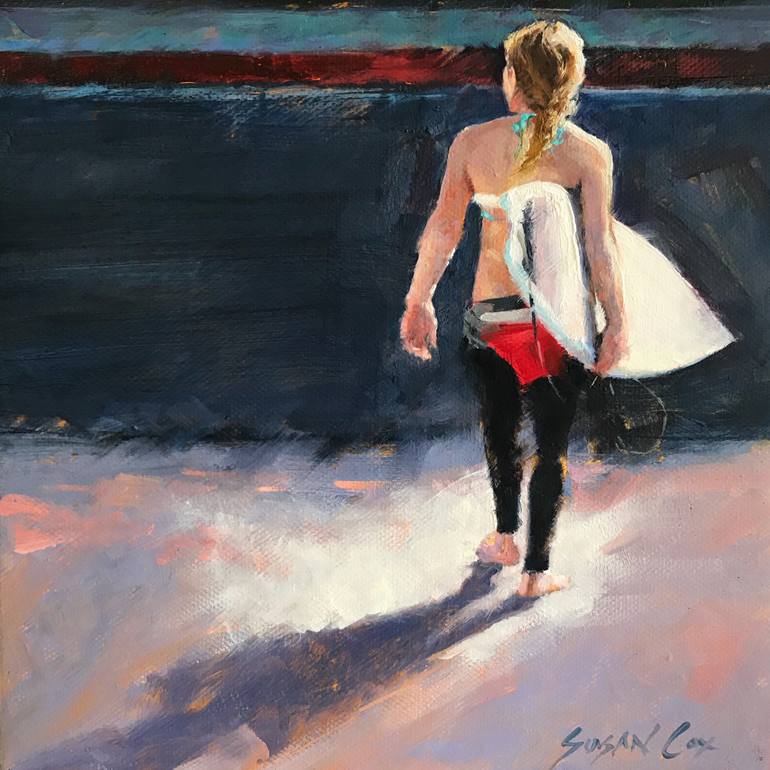 Prints from an original oil painting. I live in a surfing town - San Clemente, CA. So it’s not unusual to see surfers carrying boards but I thought the image of this girl carrying her board reminded me that there are carefree times. We just have to make time for them. This is available as a digit...