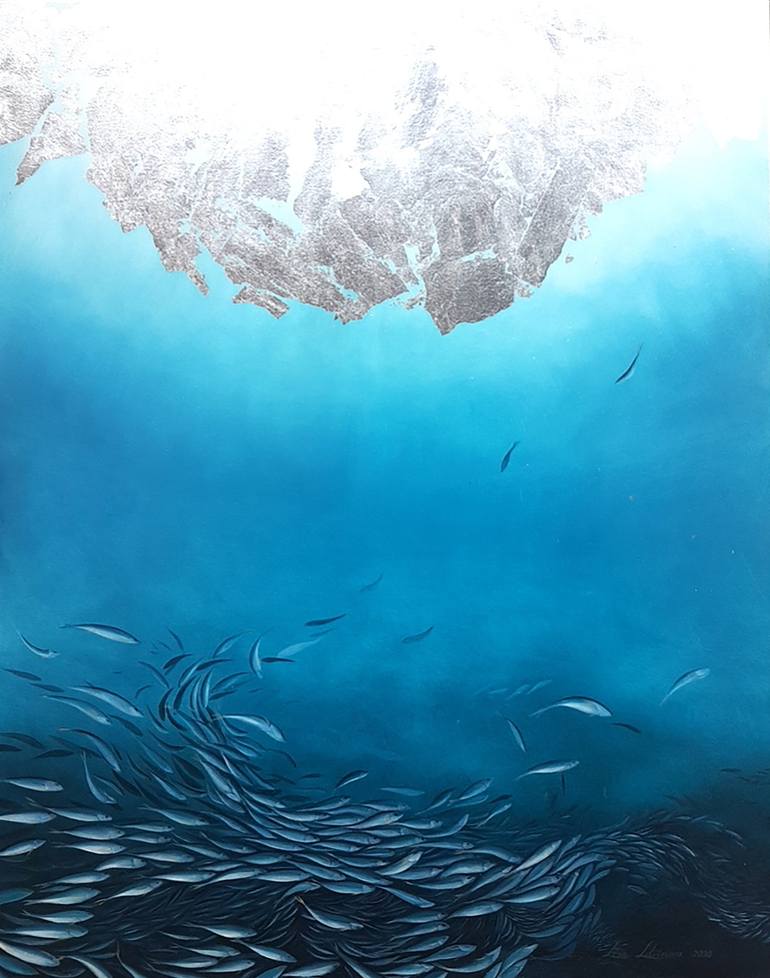 Hold your breath and dive deep. Life is a beautiful present. Under the Surface is one from the underwater series. it is created with metal leaflets. They refletcting on the top part of painting and imitating ice. Video and details of the painting can be seen on my instagram .litvinovalera