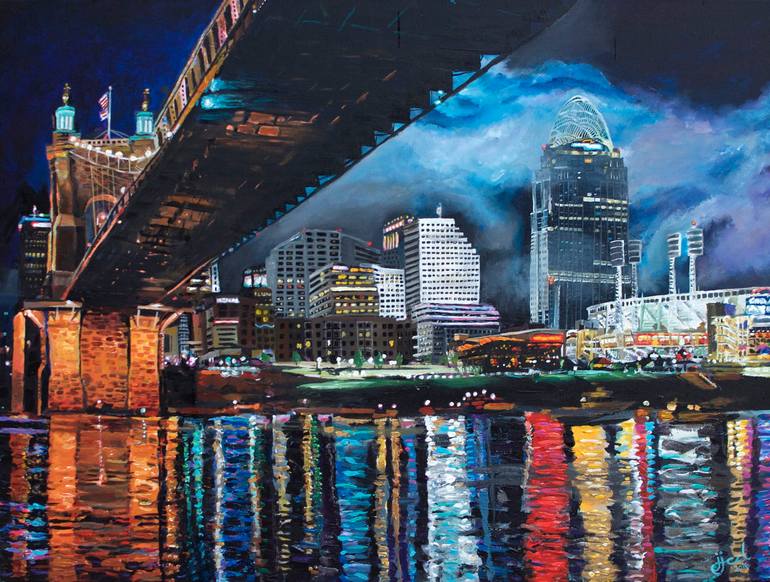 This painting was inspired by a photograph that taken from my boat on the Ohio River. Inspired by unique perspective of being under the bridge and actually on the river really draws you into the city and perches you right under all the magical lights of Cincinnati.